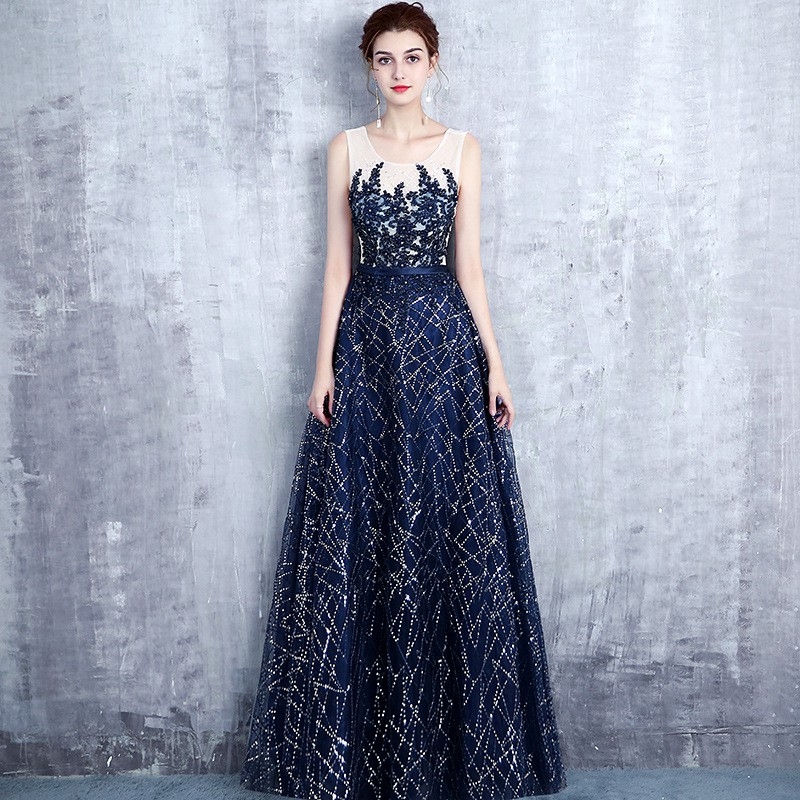 Banquet Evening Dress Female Elegant Navy Blue Birthday Party